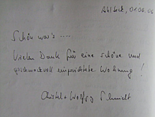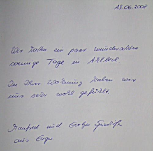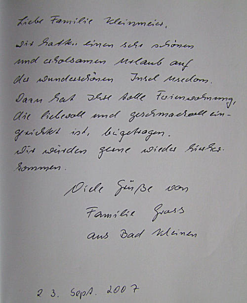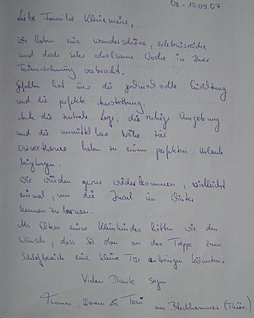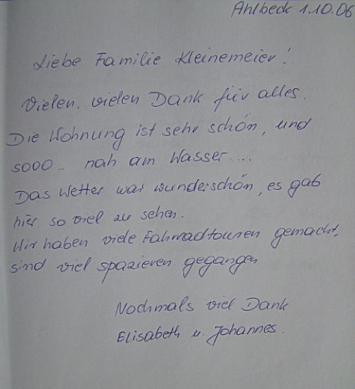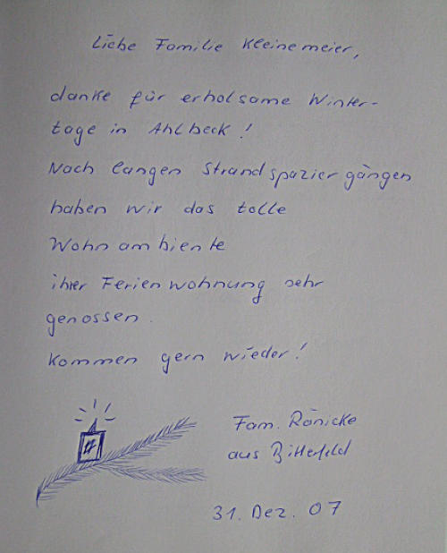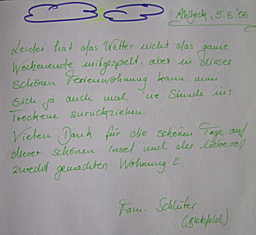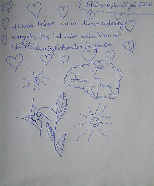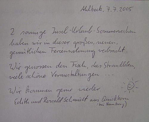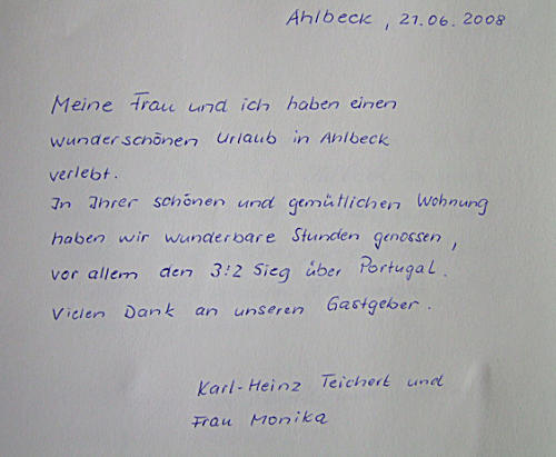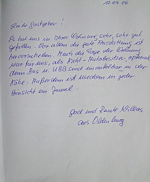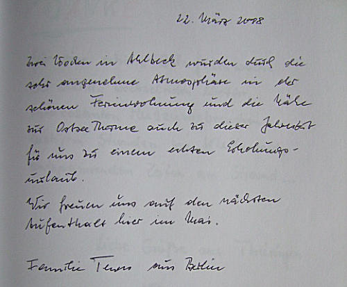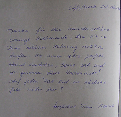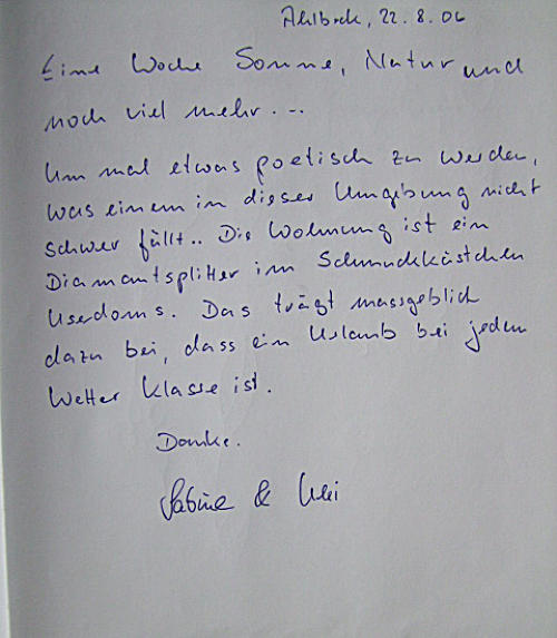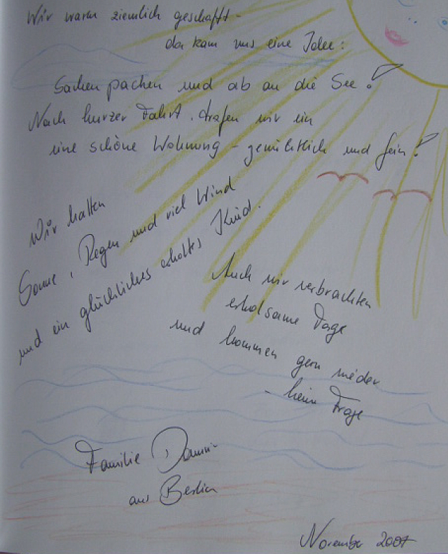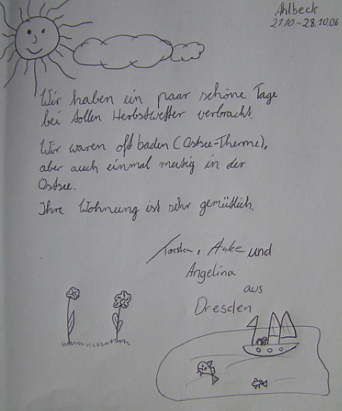 GästebuchSeit 2004 vermieten wir unsere Ferienwohnung in den Kaiserbädern in Ahlbeck. In dieser Zeit haben wir viele zufriedene Feriengäste beherbergt, manche von Ihnen haben sich in unserem Gästebuch verewigt. Einen kleinen Auszug daraus sehen Sie hier:
